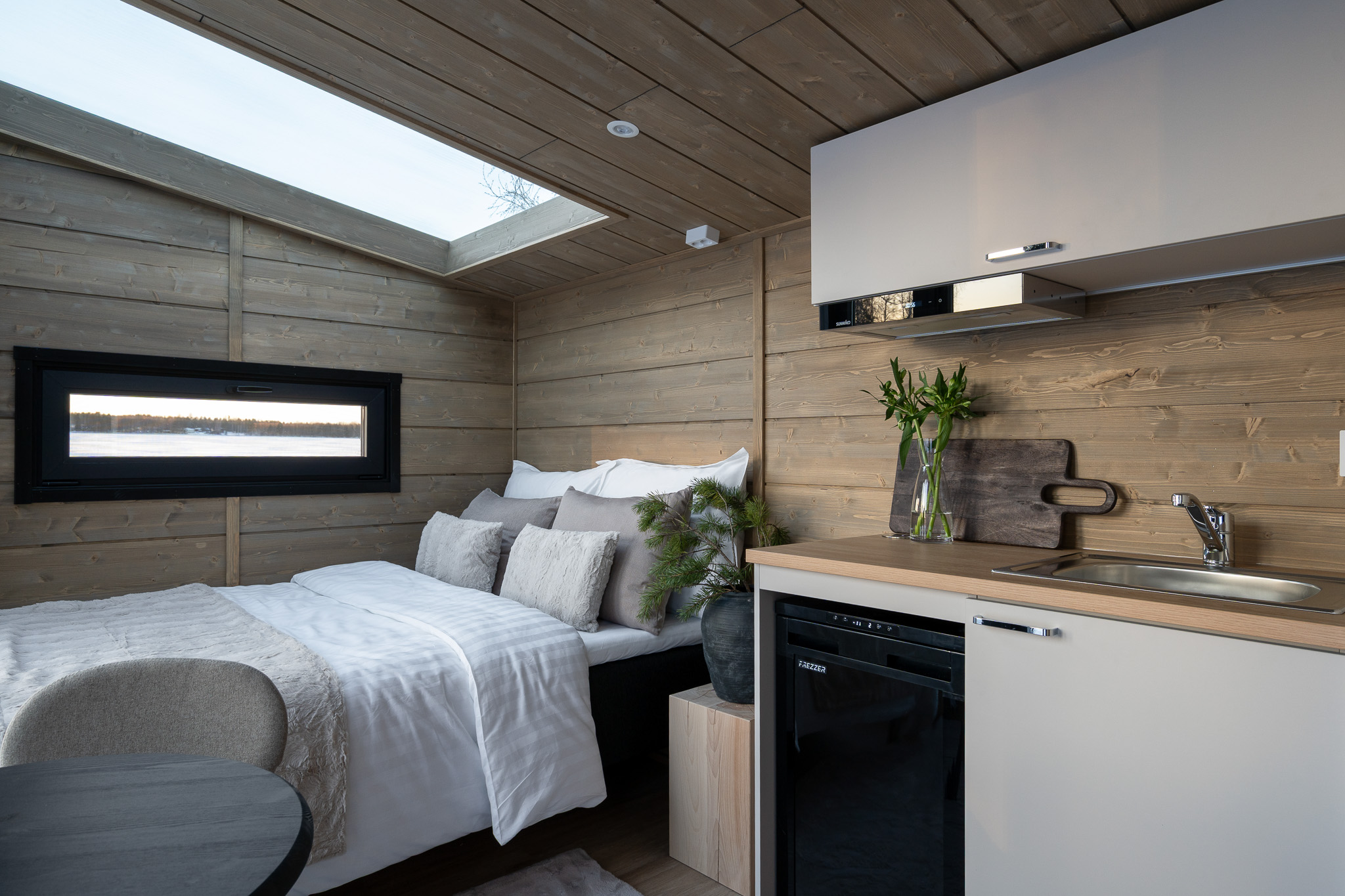 Kahdella erillisellä makuuhuoneella varustettu vaunumökki perheille tai esimerkiksi henkilökunnan majoittamiseen.