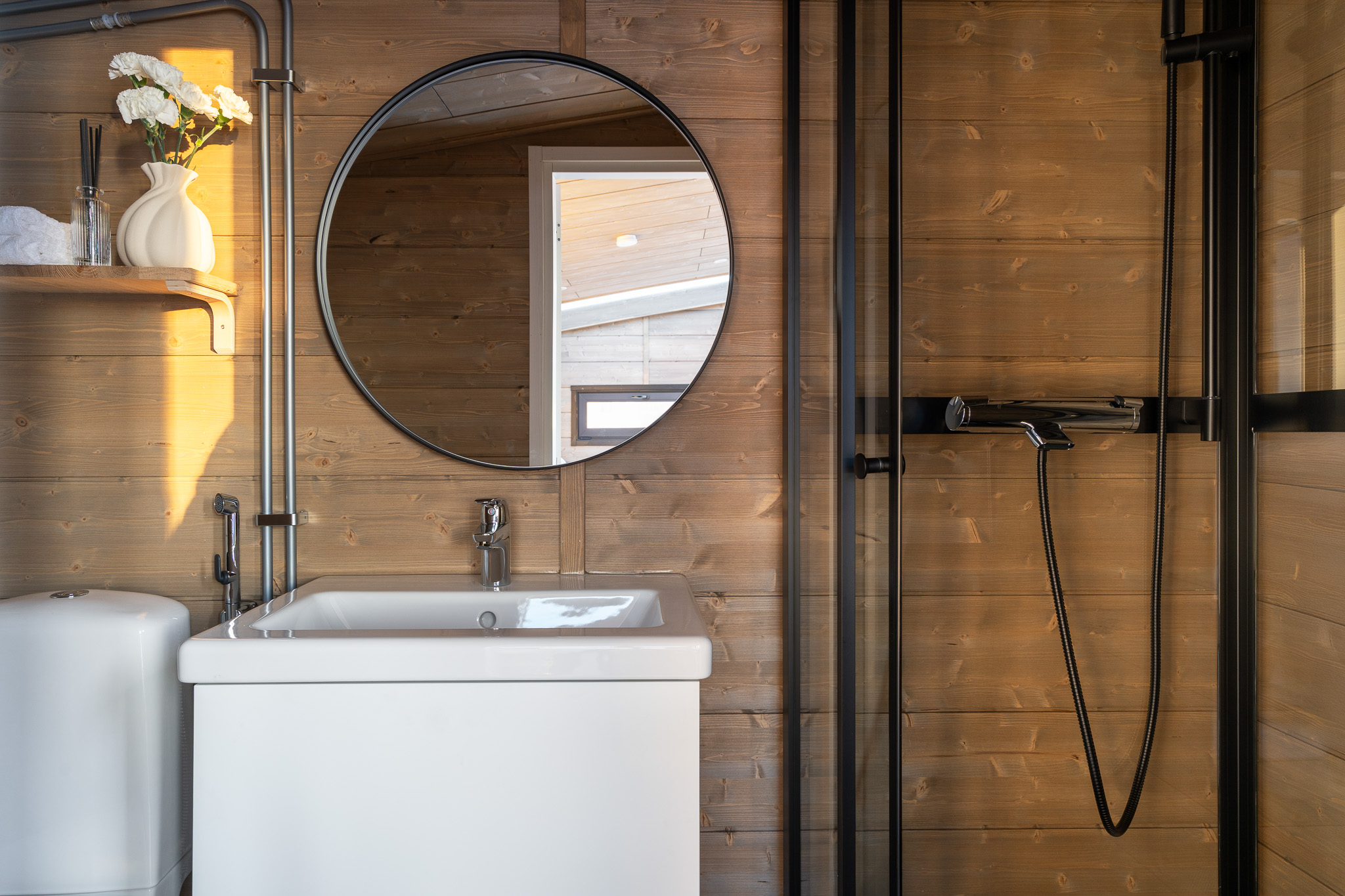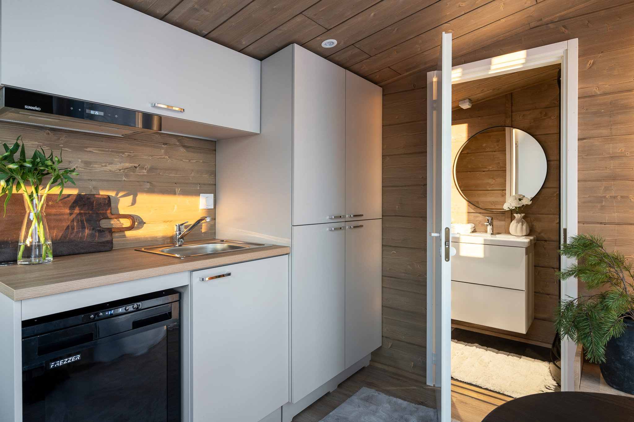 Mökkivaunu kylpyhuoneella toimii niin loma-asuntona, yllätysvieraiden majoituspaikkana kuin etätyökotinakin.