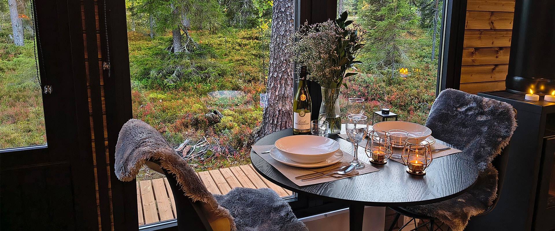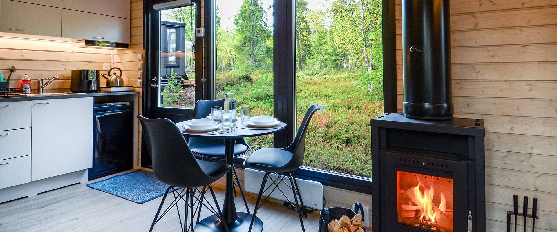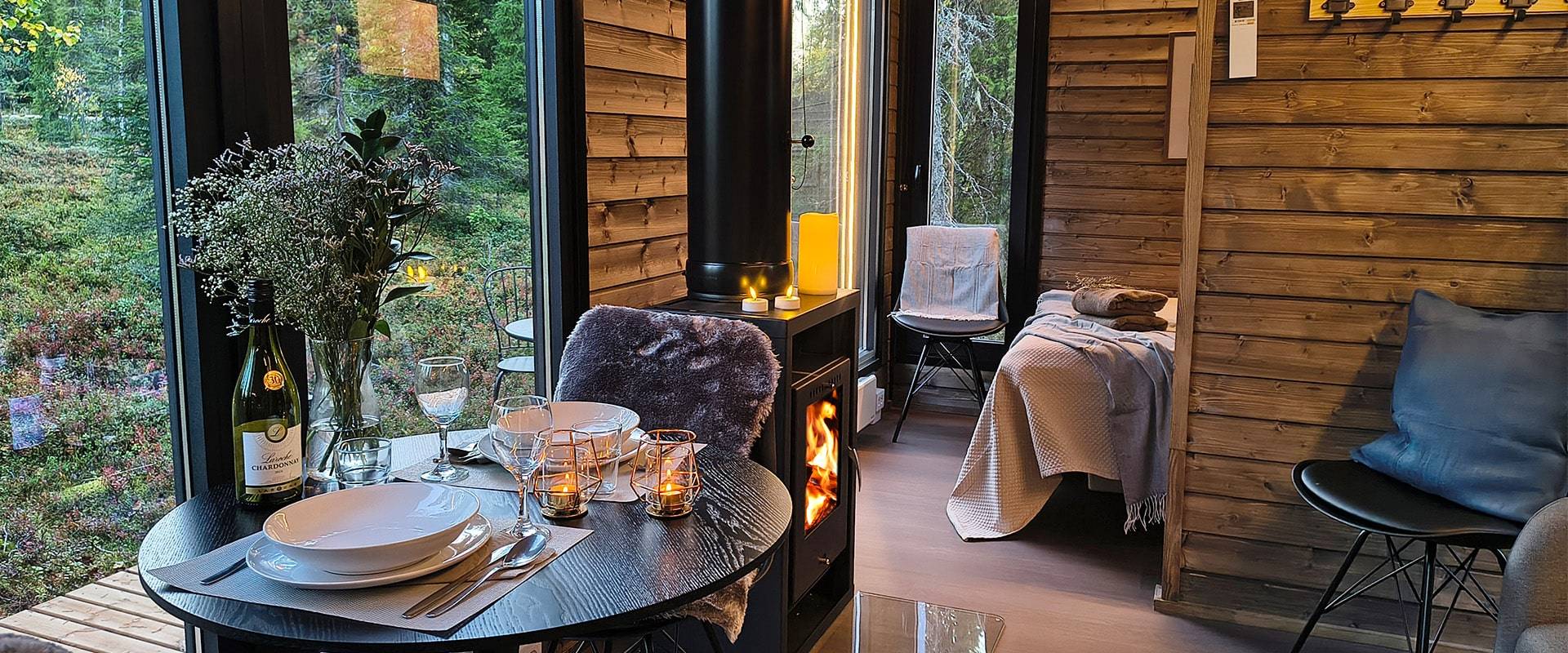 Kahden erillisen makuuhuoneen ansiosta mökki muuntautuu vaivattomasti perheiden, ystäväporukan tai vaikkapa etätyöpisteen käyttöön. Tupakeittiö yhdistyy oleskelutilaan luontevasti, ja suuret maisemaikkunat avaavat näkymän ympäröivään luontoon.