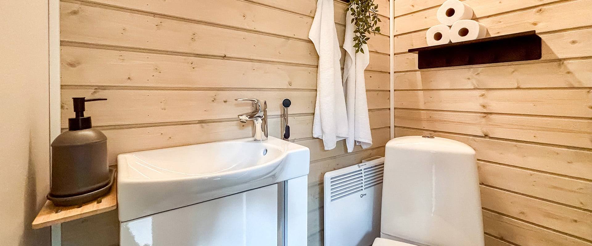 Nykyaikaisesti varustellussa kylpyhuoneessa on tilava suihku, laadukkaat kalusteet ja tarkkaan suunnitellut säilytysratkaisut, jotka tekevät mökkeilyn päivittäisistä rutiineista miellyttäviä.