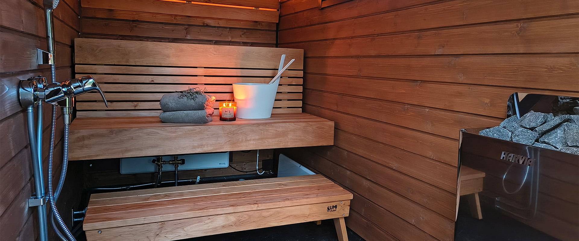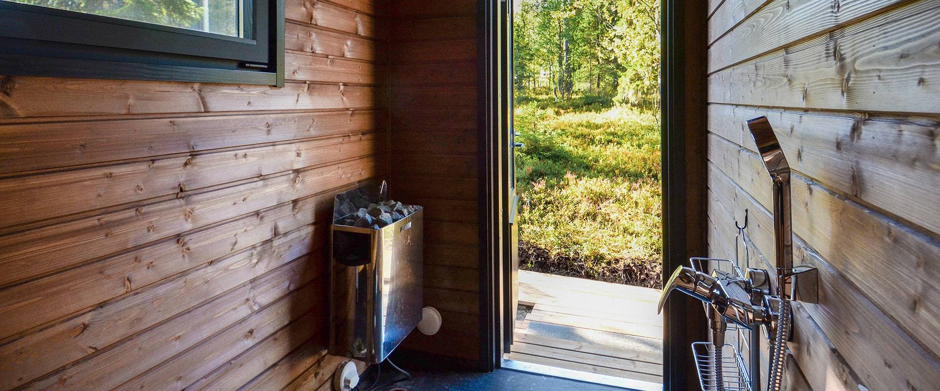 Saunan perinteinen puukiuas ja tilavat lauteet kutsuvat nauttimaan pitkistä löylyhetkistä, ja löylyhuoneen ikkuna tuo luonnon osaksi kokemusta. Saatavilla kahdessa eri variaatiossa: toisessa saunaan on käynti mökin sisältä, ja toisessa saunasta on oma käynti suoraan ulos.