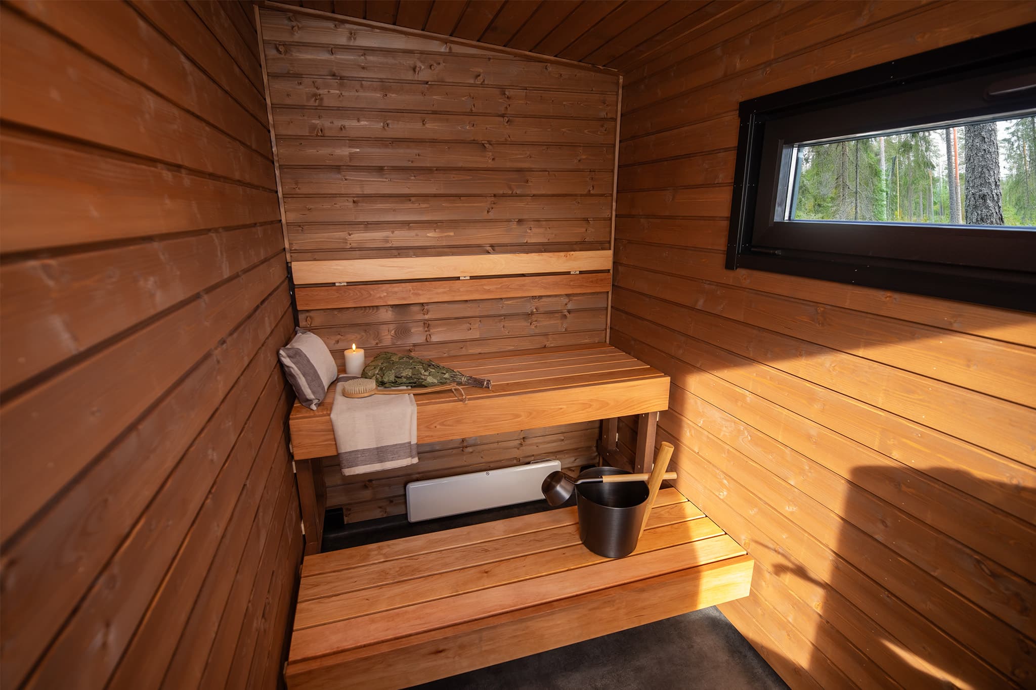 Saunan perinteinen puukiuas ja tilavat lauteet kutsuvat nauttimaan pitkistä löylyhetkistä, ja löylyhuoneen ikkuna tuo luonnon osaksi kokemusta. Saatavilla kahdessa eri variaatiossa: toisessa saunaan on käynti mökin sisältä, ja toisessa saunasta on oma käynti suoraan ulos.