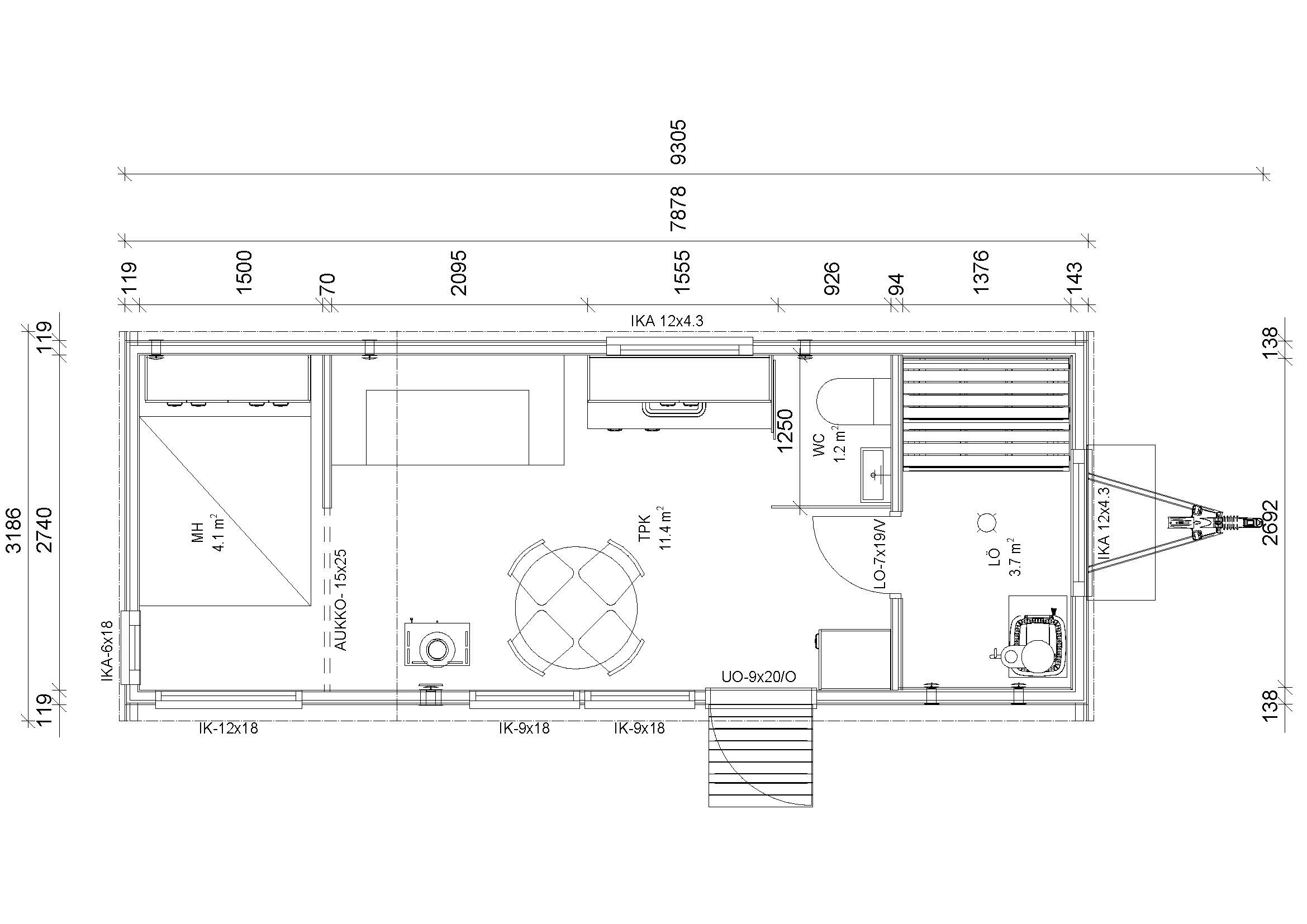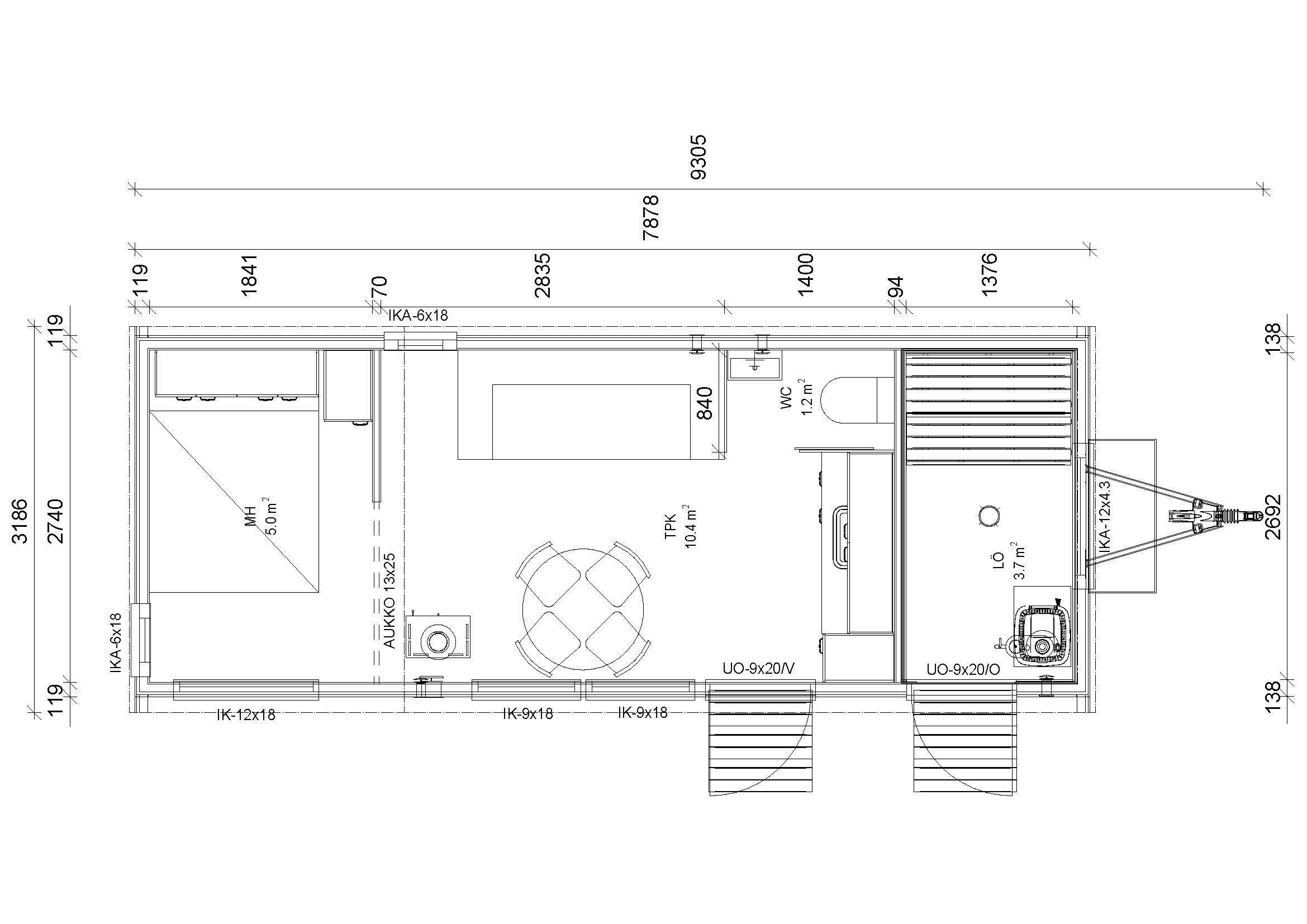 Tähän malliin voit valita saunan, kylpyhuoneen, makuuhuoneen tai tupla-makuuhuoneen.
